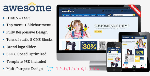 Awesome is a responsive multipurpose OpenCart theme which is fully customizable and suitable for any kind of OpenCart store on any device. This responsive theme is a general purpose responsive theme which can be highly customized and tailored for any heavy OpenCart store.